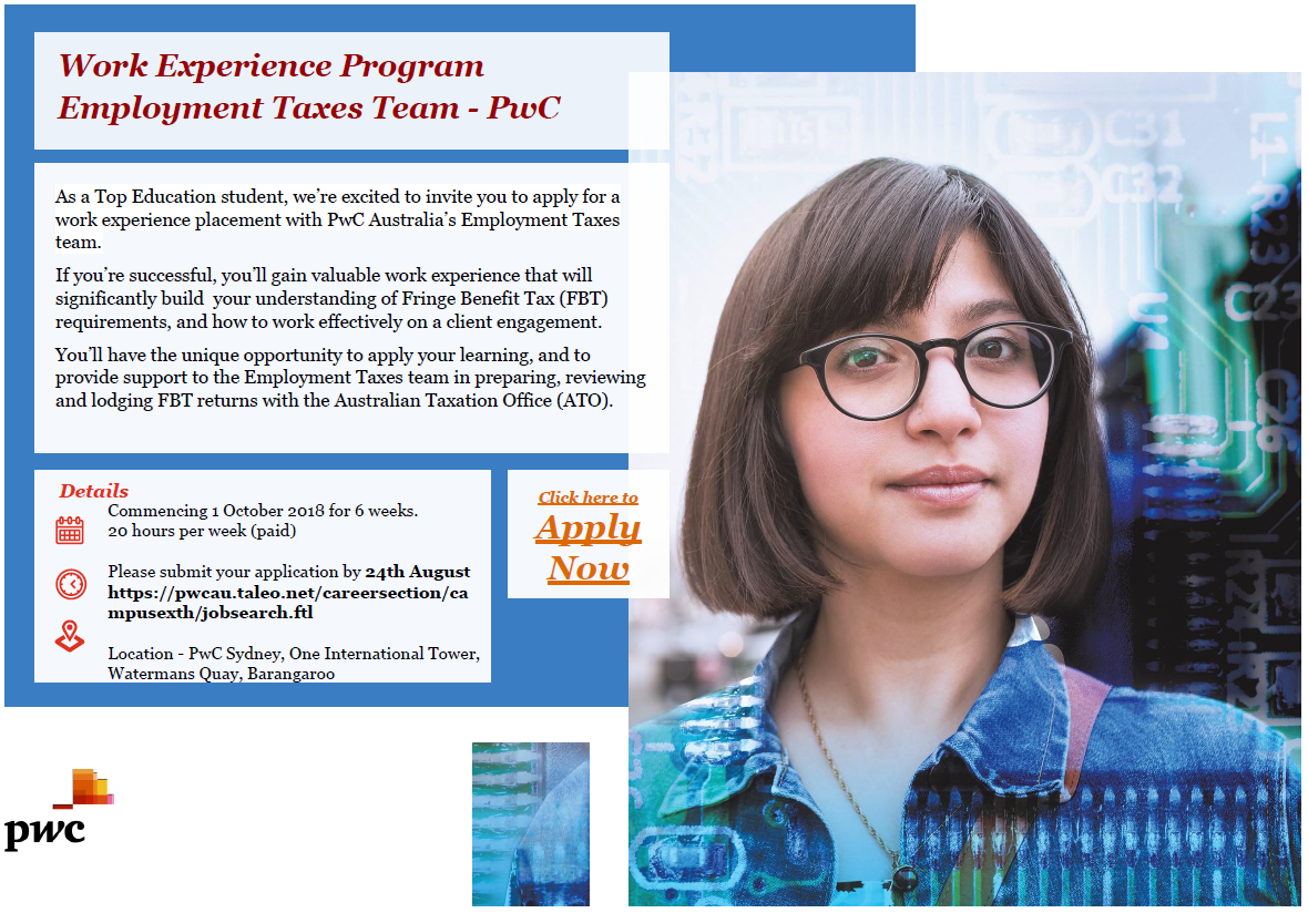 As a Top Education student, we’re excited to invite you to apply for a  work experience placement with PwC Australia’s Employment Taxes team.