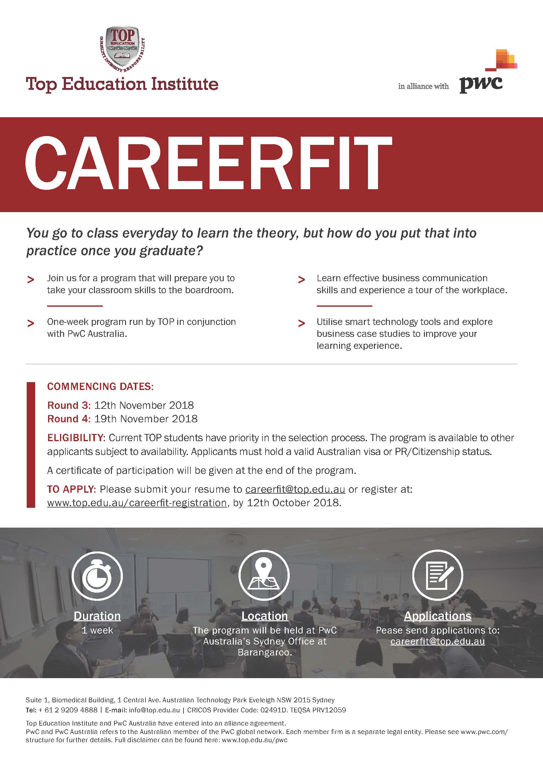 CareerFit 12 November and 19 November rounds open for applications, seats limited, apply now!!! by Simon Li - Monday, 3 September 2018, 11:22 AM Number of replies: 0 Please submit your resume to careerfit@top.edu.au or Register at www.top.edu.au/careerfit-registration, by 12th October 2018. Permalink