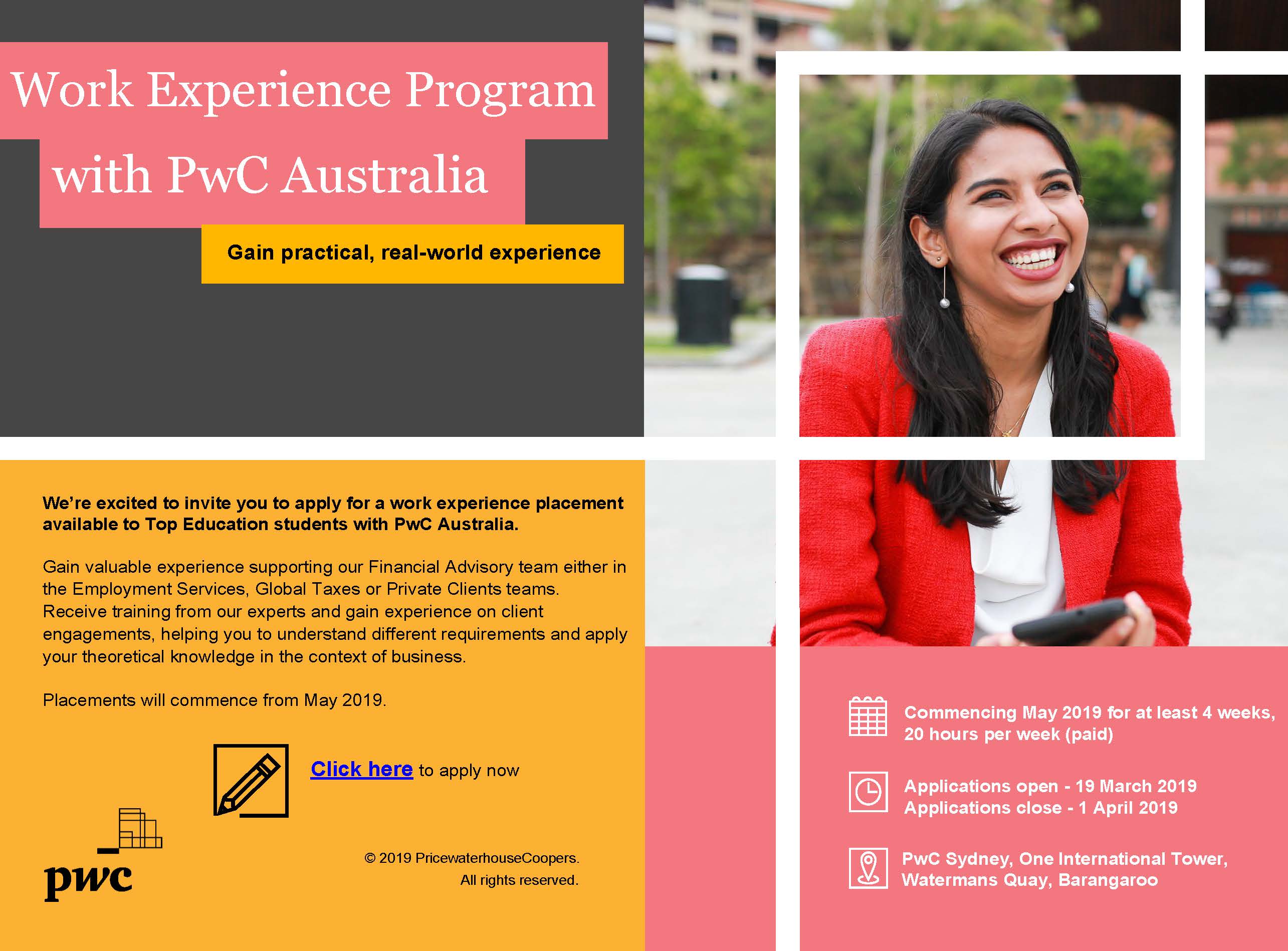 We’re excited to invite you to apply for a work experience placement available to Top Education students with PwC Australia.